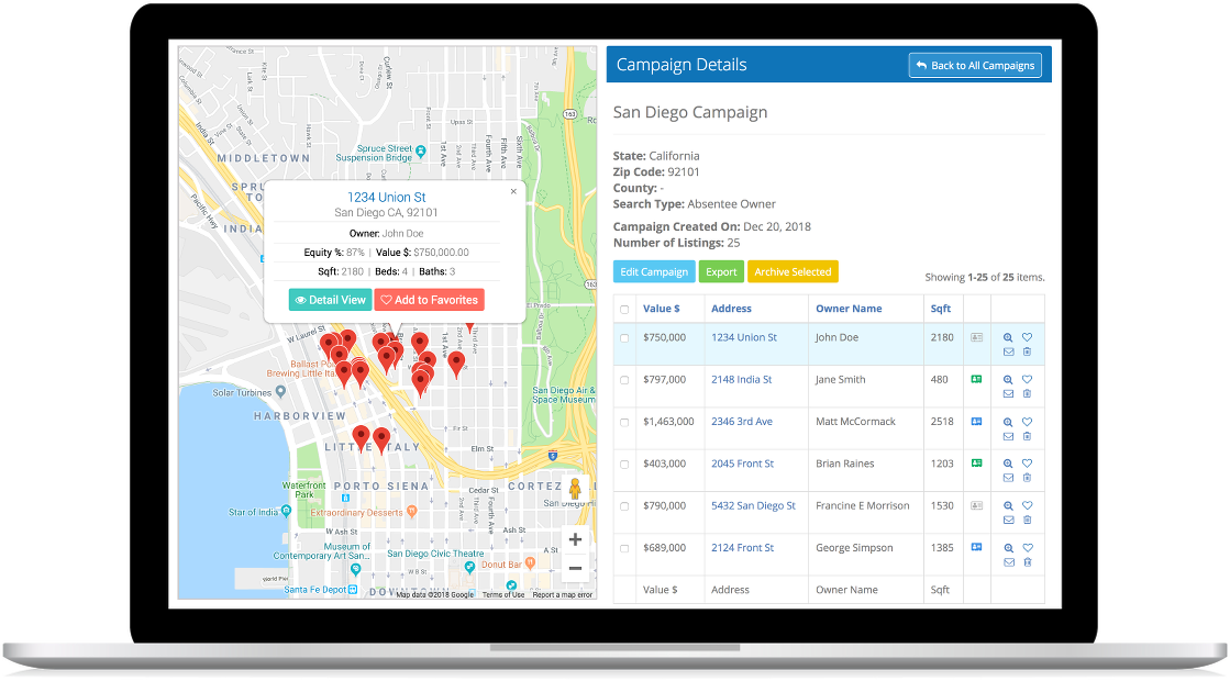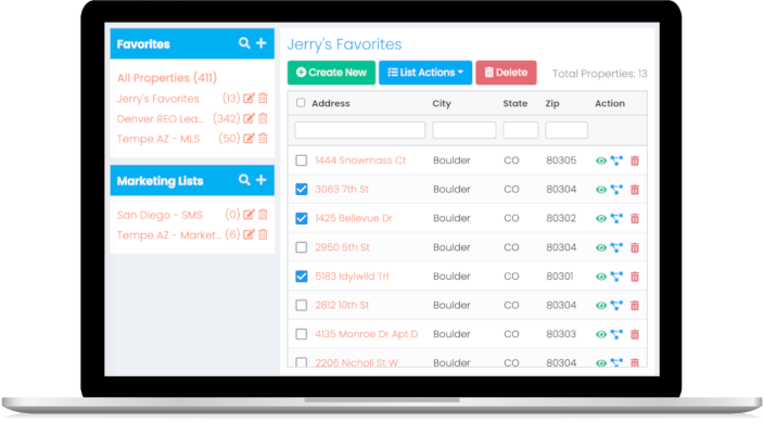 A property list dashboard, with “quick actions” for launching direct mail, RVM, and skip tracing campaigns with one click!